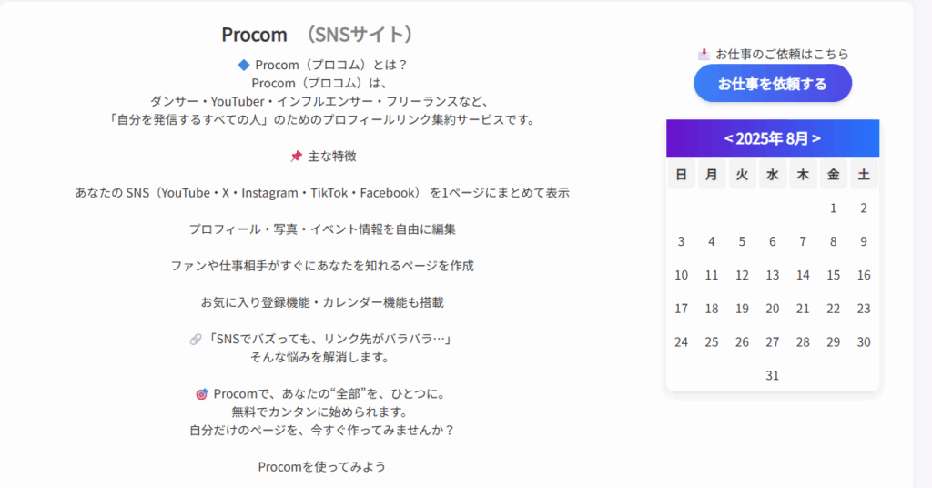 Procom は、あなたのSNSや活動情報を1ページにぎゅっとまとめて魅せられるプラットフォームです。